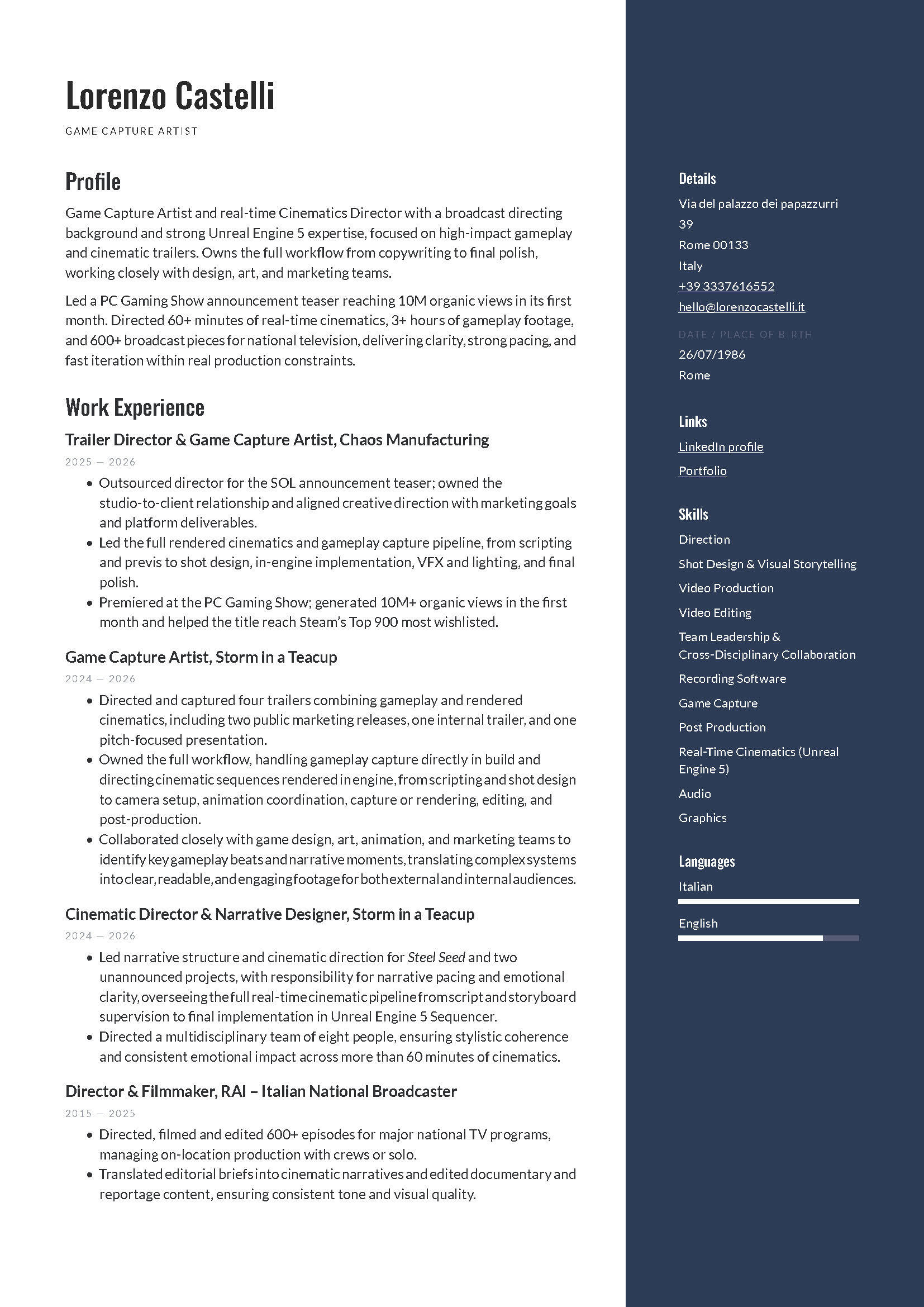 Visual storytelling has been the center of my professional life, first through working in theatre, than directing for national broadcast television, and now through capturing and shaping interactive experiences.I work as a Game Capture Artist and Cinematic Director because games require clarity, structure, and responsibility. Gameplay footage, rendered and real-time cinematics, and trailers must communicate intent clearly while remaining faithful to how the game actually plays.I bring a cross-disciplinary understanding of direction, capture, and narrative structure, working directly in engine across rendered and real-time workflows to shape gameplay presentation, cinematics, pacing, and visual readability. What I focus on is clarity: understanding what a moment needs to communicate, and how to make it readable, engaging, and effective within a system.